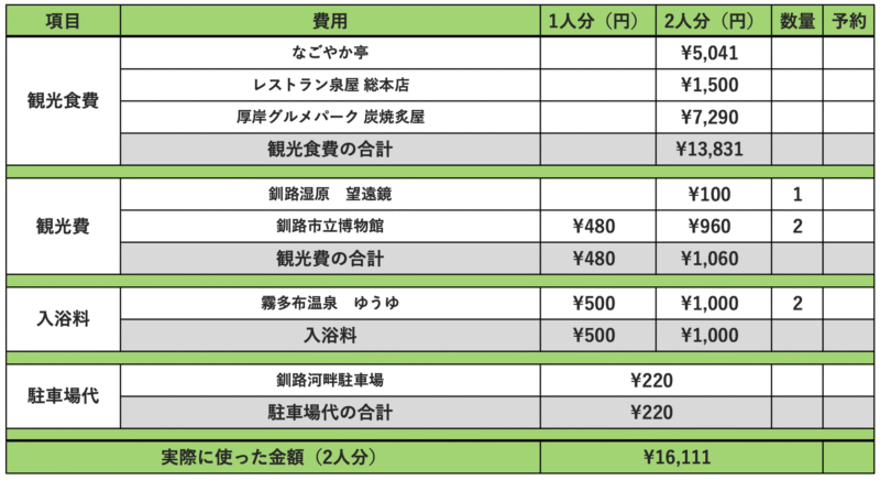 釧路をメインに、厚岸、霧多布を巡る今回の旅は、北海道ならではの大自然とグルメを満喫できる贅沢なモデルコースでした。釧路湿原の雄大な景色に心癒され、地元で愛される「なごやか亭」の新鮮なお寿司や、釧路名物「泉屋のスパカツ」に舌鼓。さらに厚岸では濃厚な牡蠣を味わい、旅の締めくくりは霧多布温泉で心も体もリフレッシュしました。移動ルートや食事の費用も参考にしながら、次の北海道旅行のプランにぜひ役立てていただけると嬉しいです。