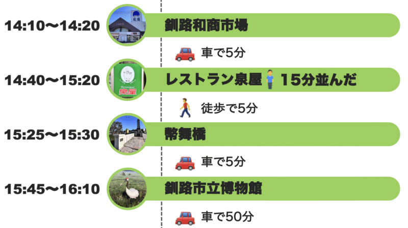 おお、盛りだくさんな一日。厚岸で牡蠣も食べれるん!釧路グルメも絶景も温泉も・・・完璧な1日コースやん。