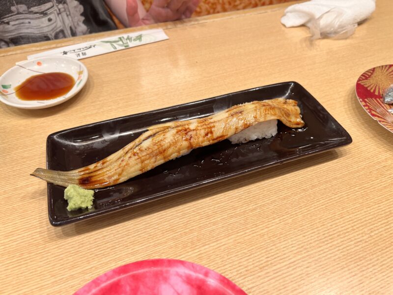 特に印象に残ったのが「穴子」。目の前に置かれた瞬間、その大きさに思わず声が出そうになりました。ふっくらと焼き上げられた穴子はシャリからはみ出すほどのボリュームで、甘辛いタレの香りがふわりと漂います。口に運ぶと、やわらかくほどける身と、絶妙にからんだタレの味わいが広がり、まるで高級寿司店の一貫を食べているよう。回転寿司という枠を超えた満足感がありました。