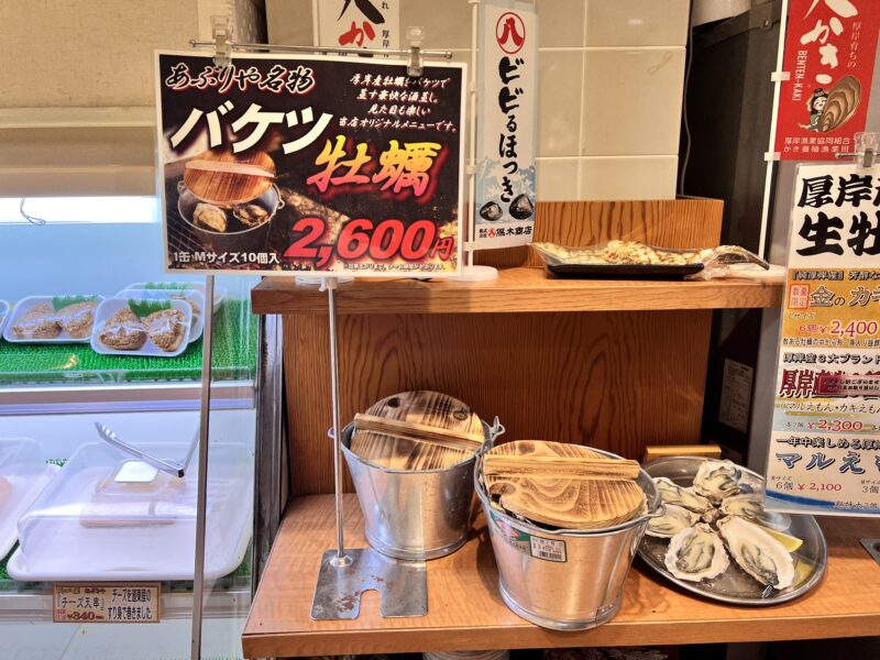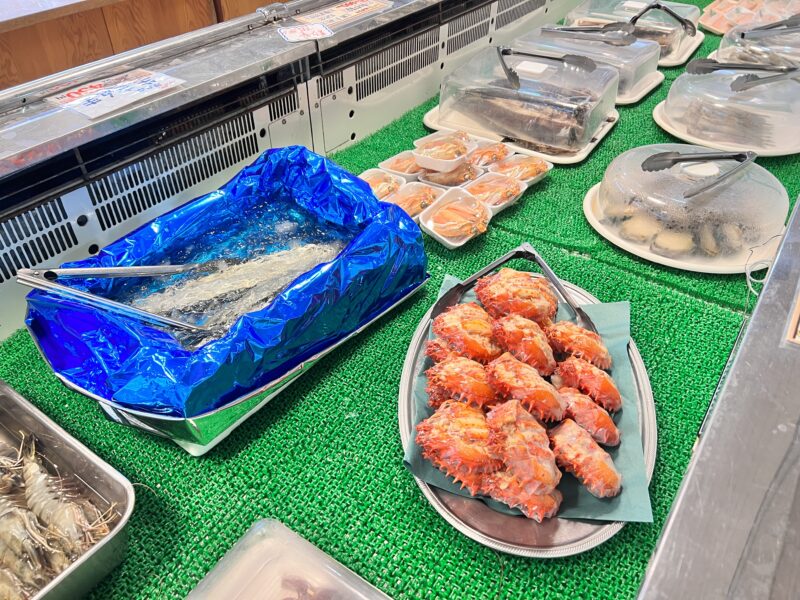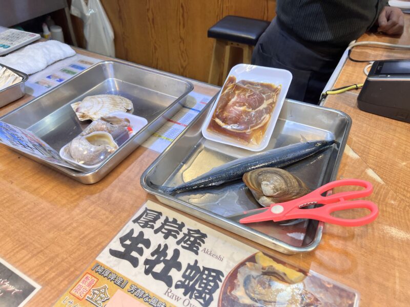 店に入るとまず“魚介市場”コーナーが目に入ります。そこには殻付き牡蠣やホッキ貝、ホタテ、サンマ、ツボダイなど、厚岸近海で獲れたばかりの海鮮がずらっと並んでおり、自分の好きなものを選べる楽しさがあります。