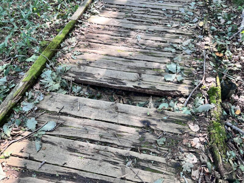 車イスでも行けるとの事でしたが、写真のように数カ所 木道が痛んでいるところがあります。これを覆い被せるような板を一緒に持って行くと車イスで行くときには便利かもしれません。