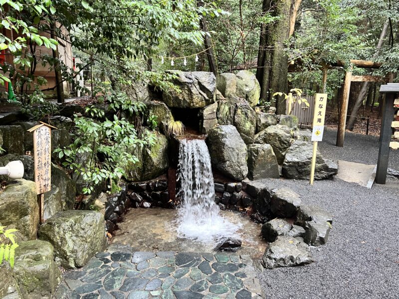 境内の奥にある「かなえ滝」は、ひっそりと佇む小さな滝ですが、多くの人が足を止める場所です。