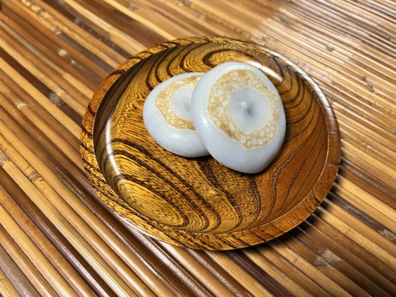 へんば餅の姿はころんと丸く平らで、両面にこんがりと香ばしい焼き目がついています。もっちりとしたお餅の中には、優しい甘さのこし餡がぎゅっと包まれていて、一口噛むごとに素材の風味がじんわりと広がるのが特徴。