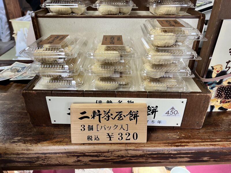 この日は、黒砂糖を使用した「くろあん二軒茶屋餅」と、青のりや大根おろしなどを添えた「三色搗餅」が数量限定で販売されていました。くろあん二軒茶屋餅は、黒砂糖ならではのコクのある甘さが特徴で、通常の二軒茶屋餅とはひと味違った、落ち着いた味わいが楽しめます。