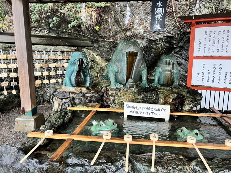 境内には「無事かえる」「貸したものがかえる」の願いを込めて蛙の像(“二見蛙”)が多数奉納されており、訪れる人々の小さな願いもそっと包み込んでくれる雰囲気が心に残ります。