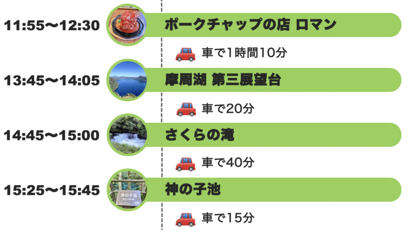 摩周湖を眺められる展望台や、斜里に移動し神の子池など歩ける観光スポットも組み込んでるから大丈夫やで。