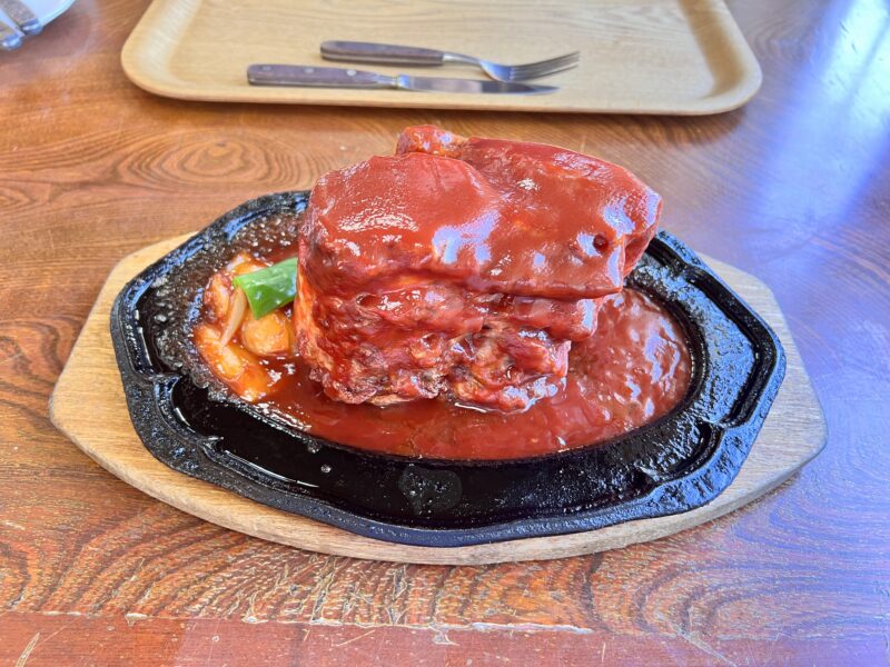 ひと口かじると、外側は香ばしくカリッと焼かれ、中はジューシーな肉汁が溢れ出します。ケチャップベースのソースは甘めの味付けで、分厚さゆえに、旨みがぎゅっと閉じ込められています。量はかなりのものですが、思いのほか食べ進められる一体感と満足感がありました。