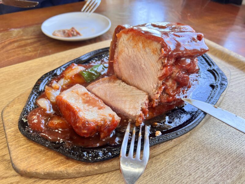 店内に入ると、カジュアルな雰囲気と共に、すでに鉄板から香ばしい香りが漂ってきました。目の前にどかんと運ばれたポークチャップ。分厚い肉塊がじゅうじゅうと音を立て、湯気とともに立ち上るソースのにおいに食欲をそそられます。
