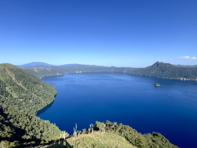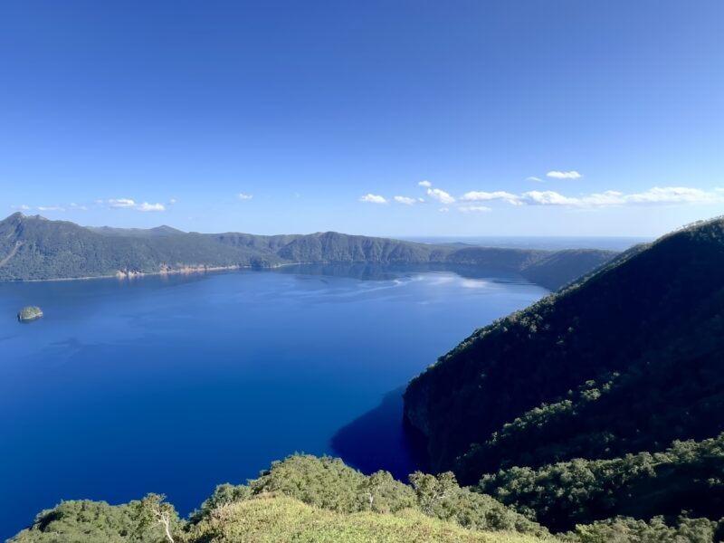展望台からは、摩周湖の湖面を間近に見ることができます。湖面はコバルトブルーに輝き、周囲の自然と調和した美しい景観が広がります。また、摩周湖に浮かぶ唯一の島「カムイシュ島」も間近に望むことができ、その姿はまるで絵画のようです。
