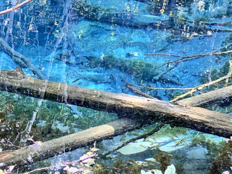 神の子池の水は、摩周湖の伏流水が1日約12,000トンも湧き出しており、年間を通して水温は約8℃に保たれています。この冷たい水が、池に沈む倒木を腐らせることなく保存しており、透明度の高さと相まってまるで水中に浮かぶ美しいオブジェのようです。また、池の中を泳ぐオショロコマの朱色の斑点が、青い水面に鮮やかに映え、自然の造形美を楽しむことができます。