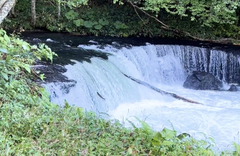 サクラマスは、産卵のために海から川を遡上しますが、この滝を越えるのは一大イベントです。ジャンプしても届かないことがほとんどで、成功するのはほんの一握り。見ていると自然と応援したくなる、そんな健気な姿が印象的です。毎年約1万匹がチャレンジし、滝を乗り越えられるのは約5%と言われています。
