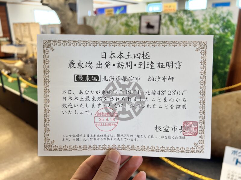 名前を書いて渡すだけで、数十秒ほどで受け取れる手軽さながら、旅の満足度は一気に上昇。証明書の裏側には最東端の緯度・経度(北緯43度23分、東経145度49分)が書かれているものもあり、地理的な“特別感”をより強く感じられます。