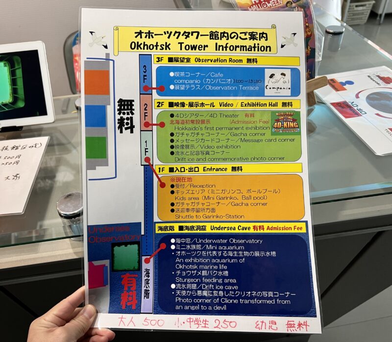 塔の内部は大きく4つのゾーンに分かれています。有料エリアの海底階には500円/人 で入場できます。ミニ水族館やクリオネ写真コーナーなど楽しいところがいっぱい!今回は海底階も行って来ました。