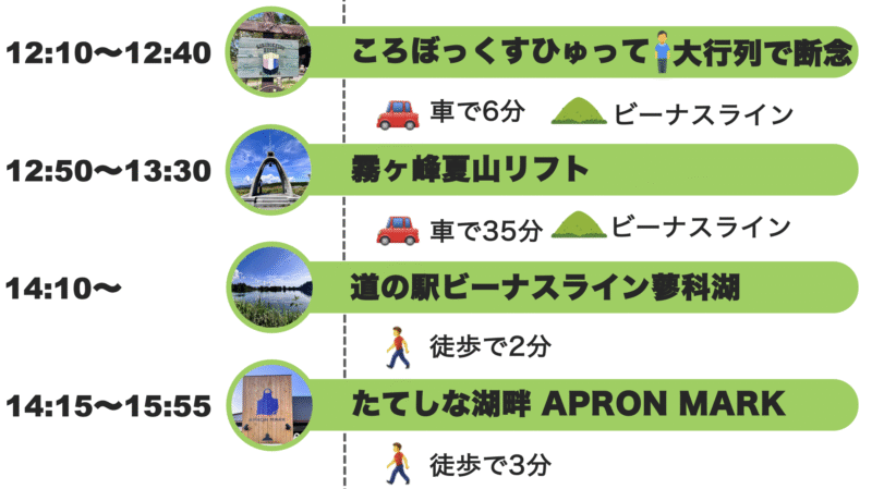 だから今回は、ビーナスラインを通りながら観光できるスポットをピックアップしてみたんだ!実際かかる費用も紹介してるからぜひ参考にしてみて!